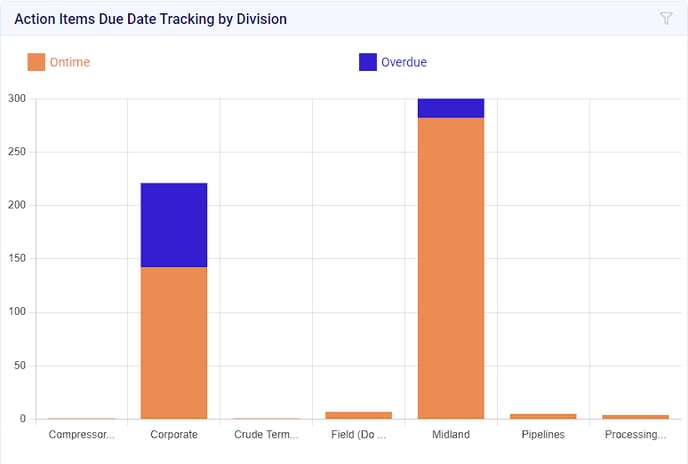 - This chart will display the number of action items which are Ontime vs Overdue organized by division. By hovering over the respective division, the data will be formatted as [Division: Number of Action Items].