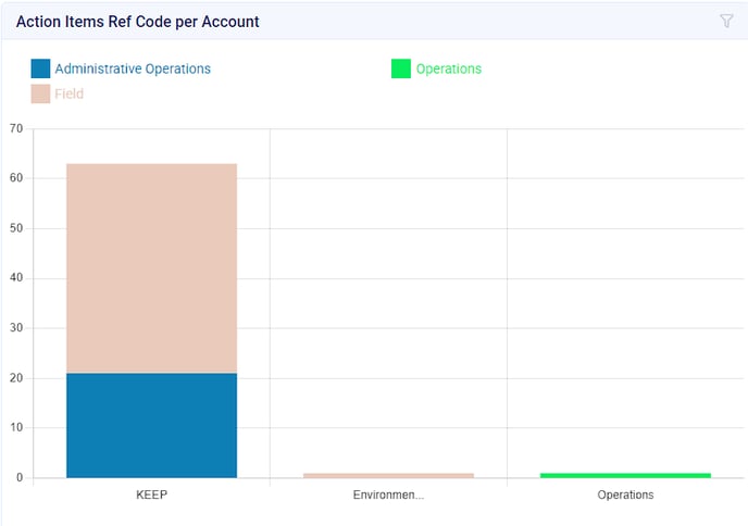 - This chart will display the number of action items submitted with a particular Ref Code, organized by Account. By hovering over the respective Ref Code, the data will be formatted as [Ref Code: Number of Action Items].