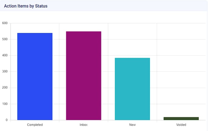 - This chart will display the number of action items in a current status. By hovering over the respective status, the data will be formatted as [Status: Number of Action Items].
