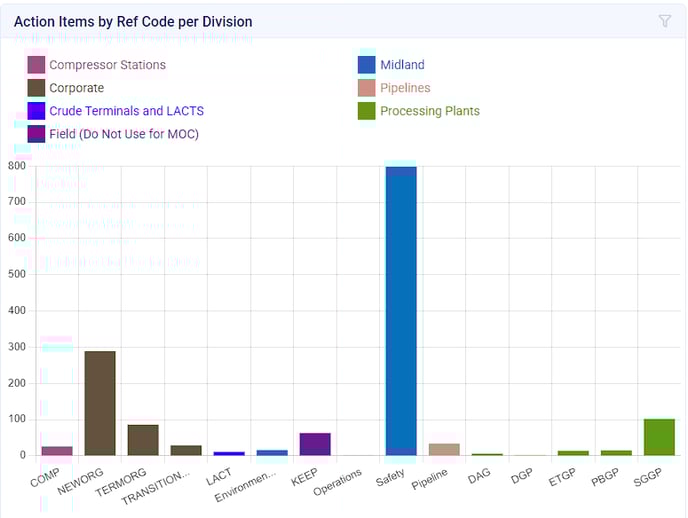 - This chart will display the number of action items submitted with a particular Ref Code, organized by Division. By hovering over the respective Ref Code, the data will be formatted as [Ref Code: Number of Action Items].