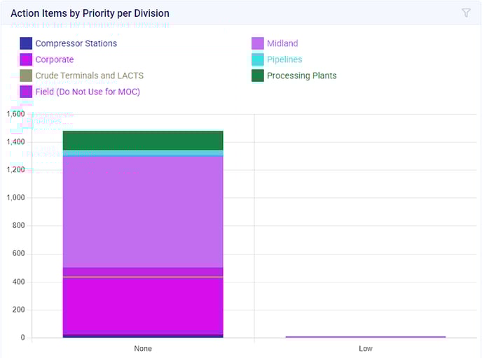 - This chart will display the number of action items submitted with a particular Priority, organized by Division. By hovering over the respective Priority, the data will be formatted as [Priority: Number of Action Items].