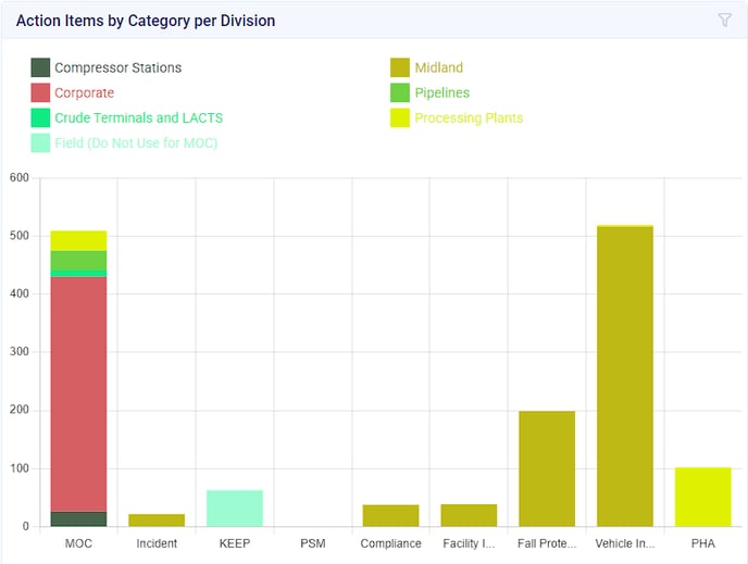 - This chart will display the number of action items submitted with a particular Category, organized by Division. By hovering over the respective Category, the data will be formatted as [Category: Number of Action Items]