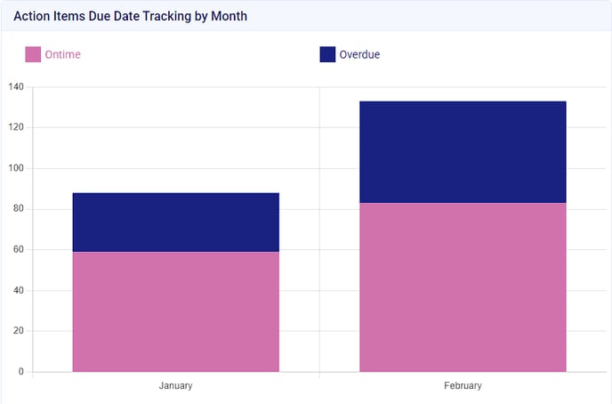 - This chart will display the number of action items which are Ontime vs Overdue organized by Month. By hovering over the respective Month, the data will be formatted as [Month: Number of Action Items].