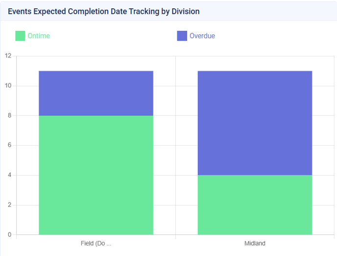 - This chart will display the quick statistic "Events Past Expected Completion Date" in more detail by showing the number of Events which are Ontime vs Overdue for all divisions. By hovering over the respective Division, the data will be formatted as [Status: Number of Events]