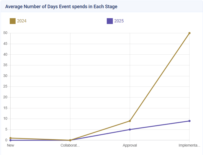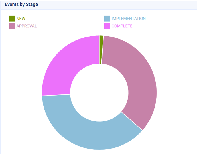 - This chart will display the number of days your companies Events are spending in each stage of the Event workflow. By hovering over the respective bar, the data will be formatted as [Stage: Number of Days.