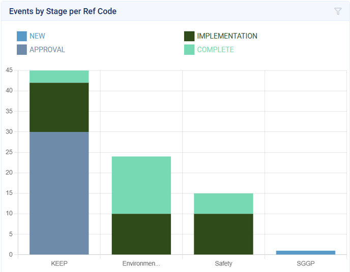 - This chart will display the number of Events grouped by stage and their respective Ref Codes. By hovering over the respective bar, the data will be formatted as [Ref Code: Number of Events].