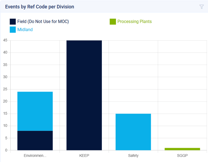 - This chart will display the number of ref codes grouped by division. By hovering over the respective bar, the data will be formatted as [Ref Code: Number of Events]