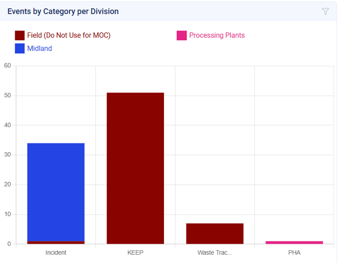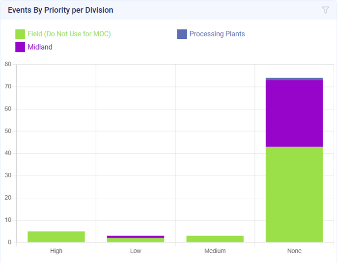 - This chart will display the number of Priorities grouped by division. By hovering over the respective bar, the data will be formatted as [Priority: Number of Events]