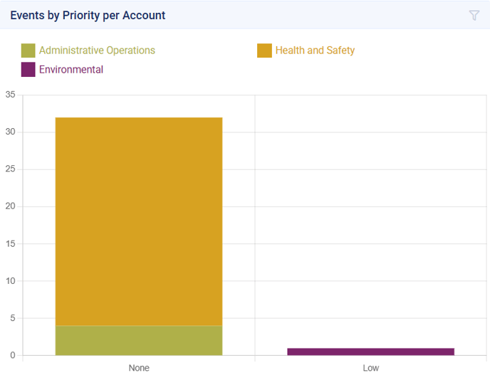 - This chart will display the number of Priorities grouped by Account. By hovering over the respective bar, the data will be formatted as [Priority: Number of Events]