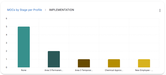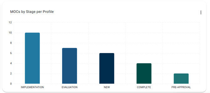 - This chart displays the total number of MOCs by Stage per profile. Hovering over a Stage will display the data in the format: [Stage: Number of MOCs].