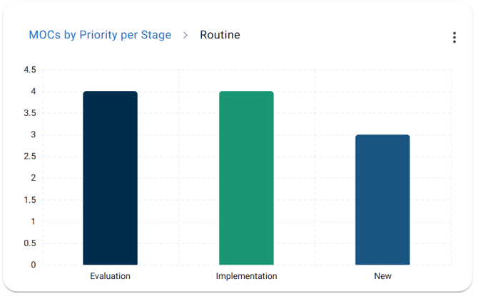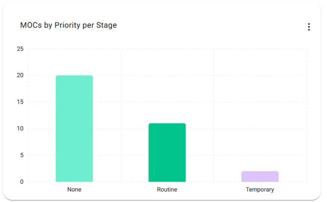 This chart displays the number of MOCs in each stage of the workflow, organized by Priority. Hovering over a bar segment displays the data in the format: [Stage: Number of MOCs].