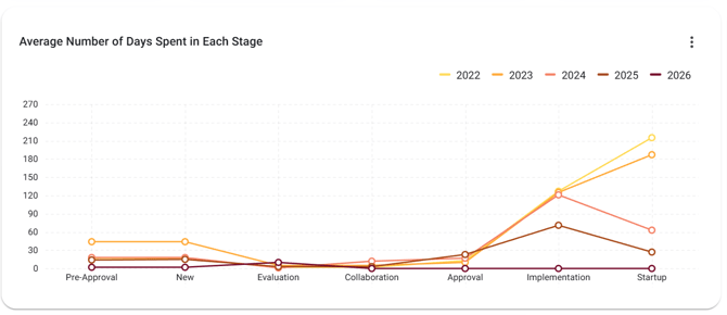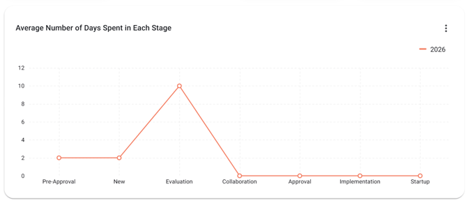 - This chart will display the average number of days an MOC stays in each stage before progressing to the next. By hovering over the respective stage, the data will be formatted as [Stage: Number of Days]
